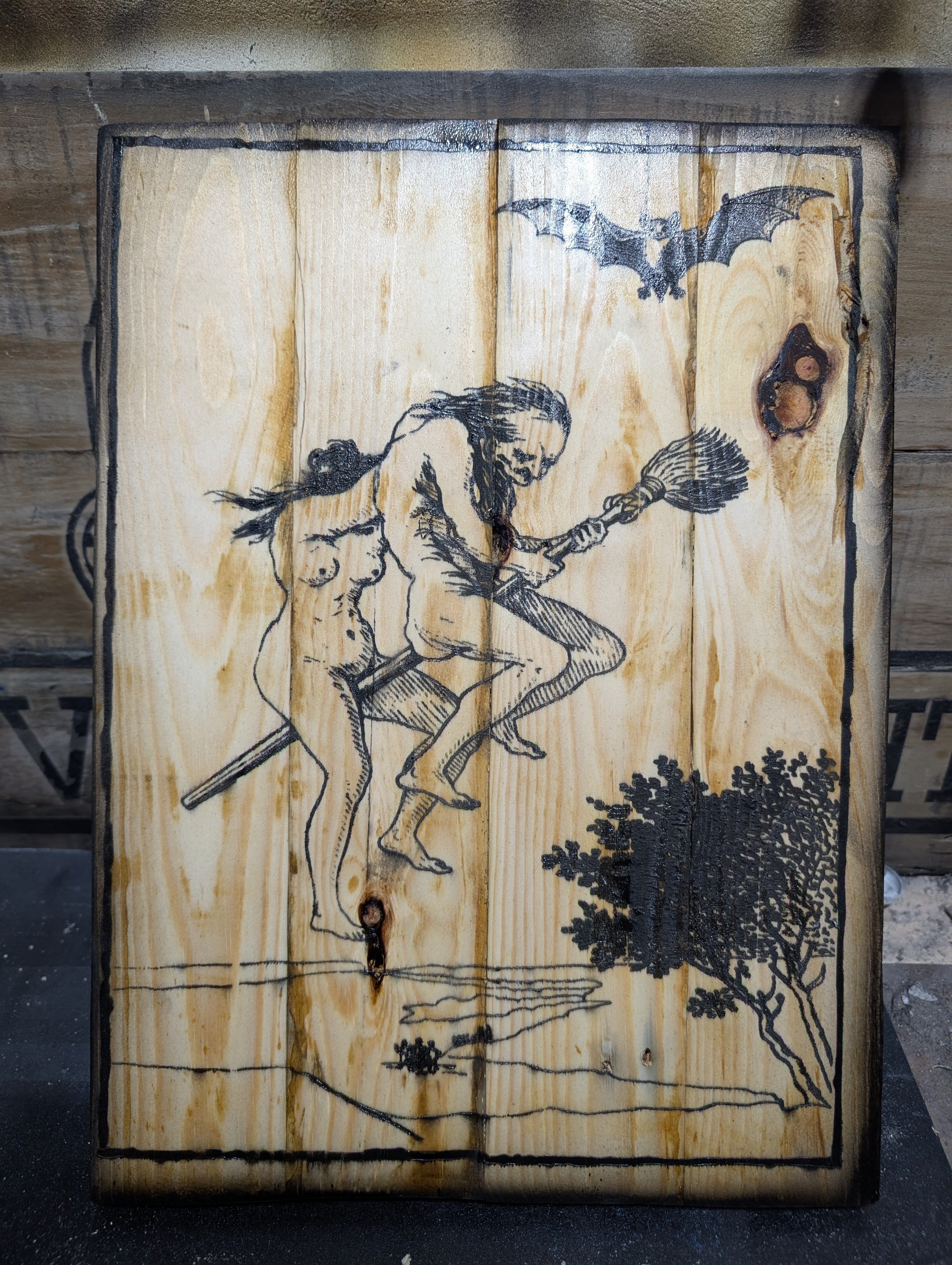Reproduction of Francisco Goya's 1798 etching of two naked witches riding on a broomstick.