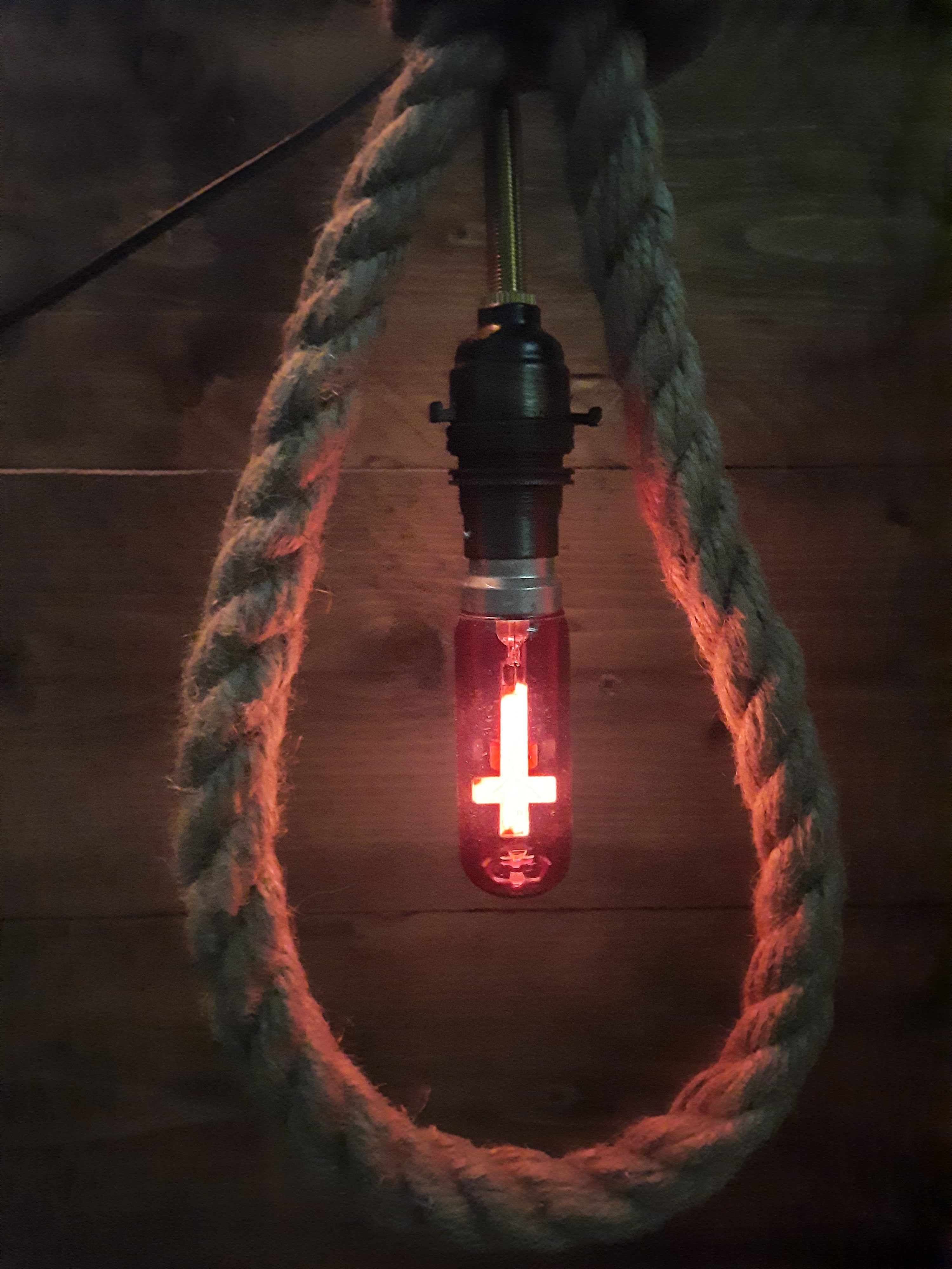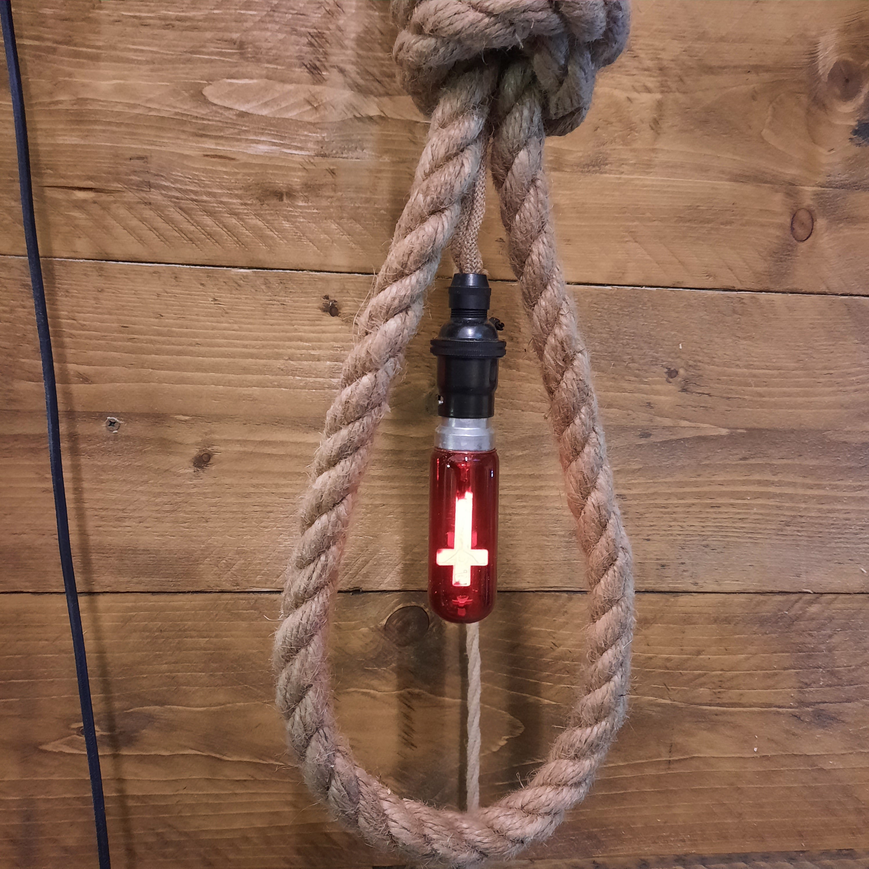 Medieval inspired wall mounted plug in hanging noose light with 3w inverted Crucifix decorative bulb!